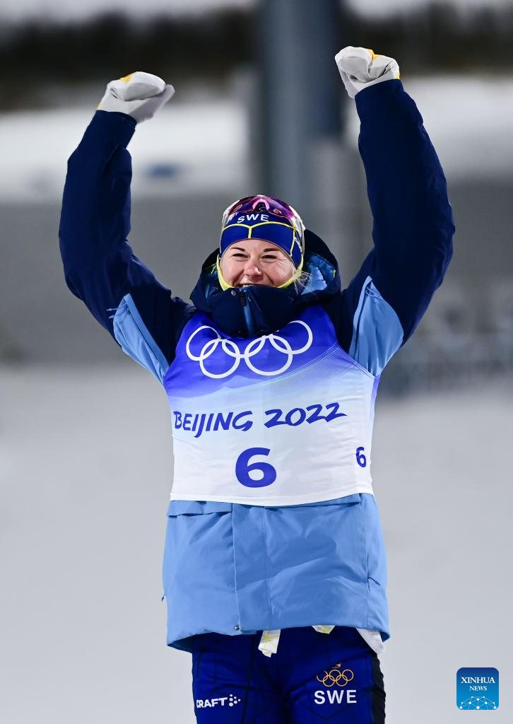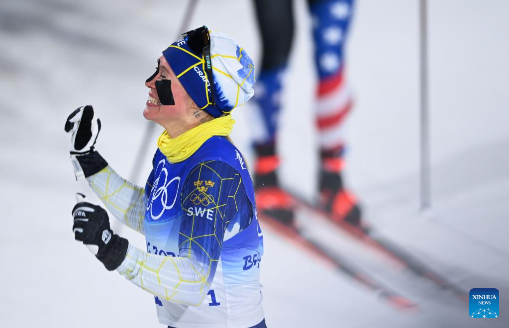 Jonna Sundling of Sweden celebrates after winning the gold medal in the women's cross-country skiing sprint free final of the Beijing 2022 Winter Olympics at Zhangjiakou National Cross-country Skiing Centre in Zhangjiakou, north China's Hebei Province, Feb. 8, 2022. (Xinhua/Zhang Hongxiang)