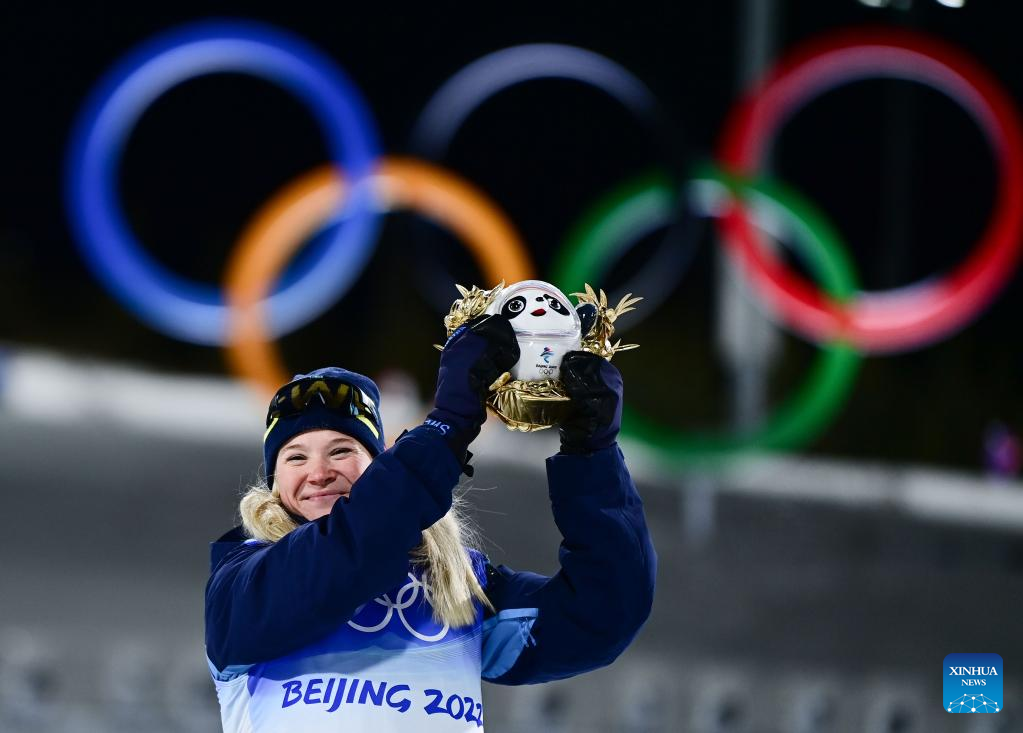 Gold medalist Jonna Sundling of Sweden poses for a photo with Bing Dwen Dwen, the mascot of Beijing 2022 Olympic Winter Games, during the flower ceremony of the women's cross-country skiing sprint free final of the Beijing 2022 Winter Olympics at Zhangjiakou National Cross-country Skiing Centre in Zhangjiakou, north China's Hebei Province, Feb. 8, 2022. (Xinhua/Zhang Hongxiang)