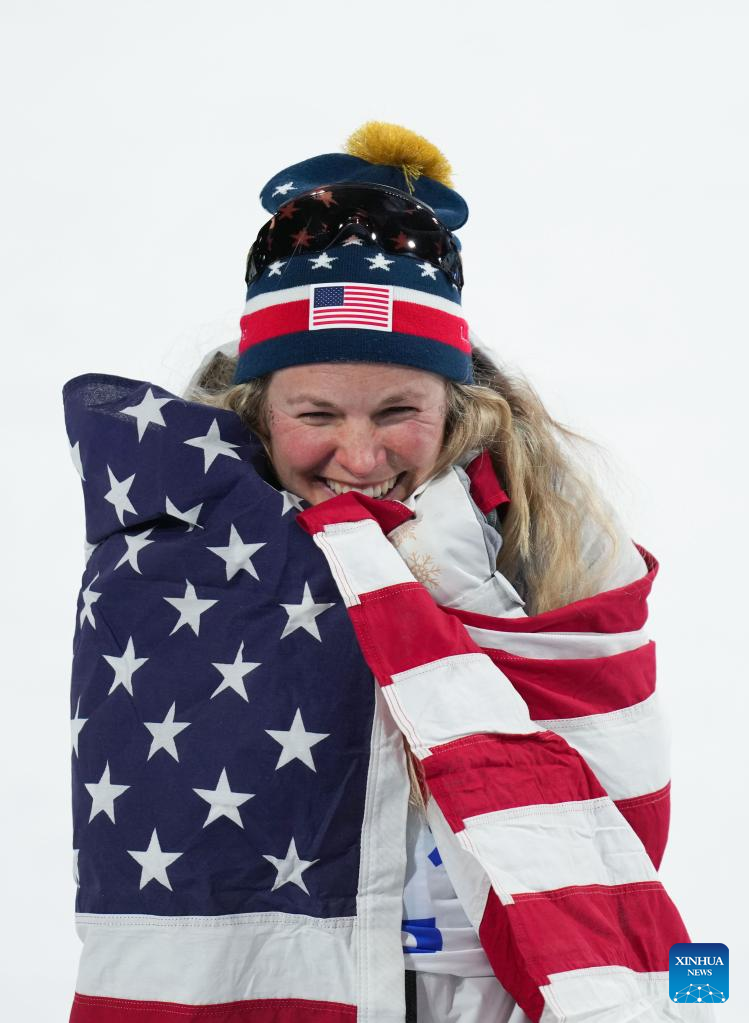 Bronze medalist Jessie Diggins of the United States celebrates after the women's cross-country skiing sprint free final of the Beijing 2022 Winter Olympics at Zhangjiakou National Cross-country Skiing Centre in Zhangjiakou, north China's Hebei Province, Feb. 8, 2022. (Xinhua/Wang Song)