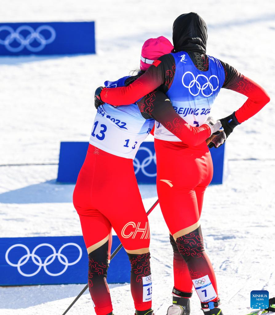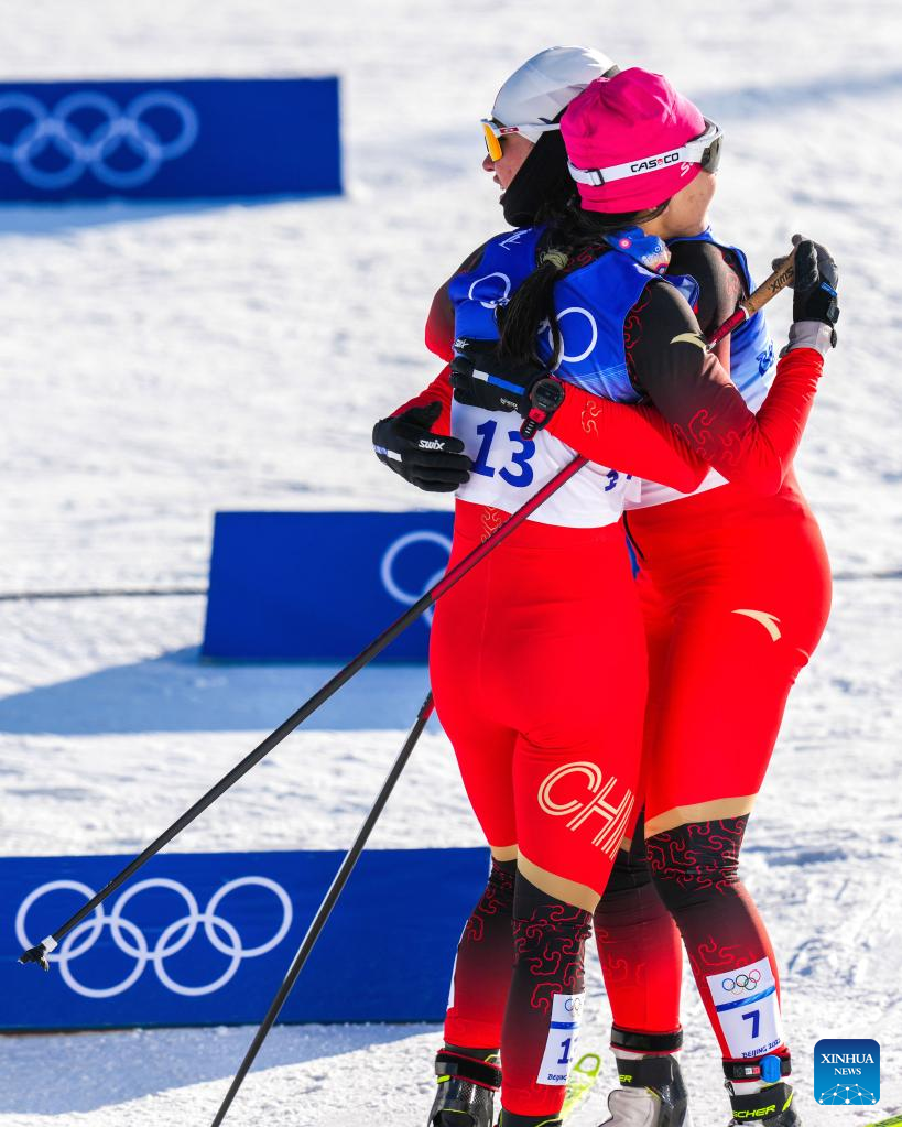 Bayani Jialin (R) of China hugs with her teammate after the cross-country skiing women's sprint free qulification match of Beijing 2022 Winter Olympics at Zhangjiakou National Cross-country Skiing Centre in Zhangjiakou, north China's Hebei Province, Feb. 8, 2022. (Xinhua/Wang Song)