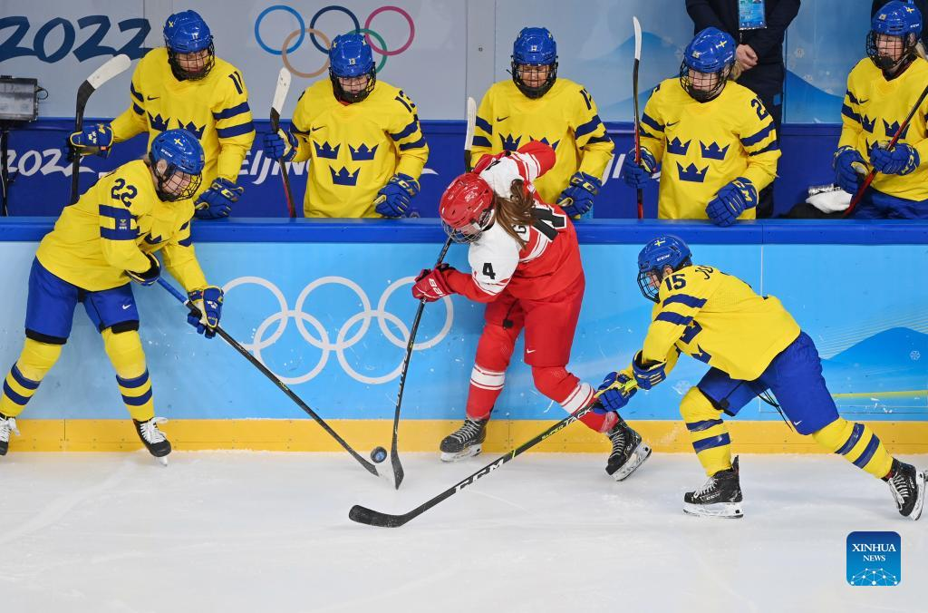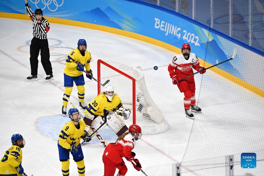 Athletes react during the ice hockey women's preliminary round group B match between Sweden and Denmark at Wukesong Sports Centre in Beijing, capital of China, Feb. 8, 2022. (Xinhua/Li Ran)