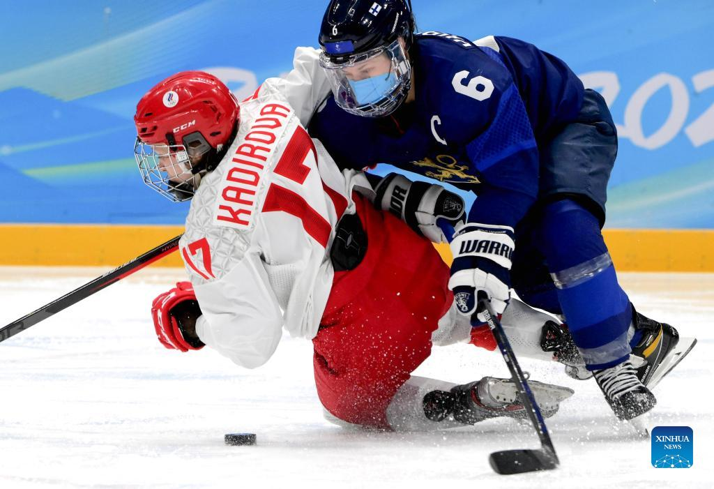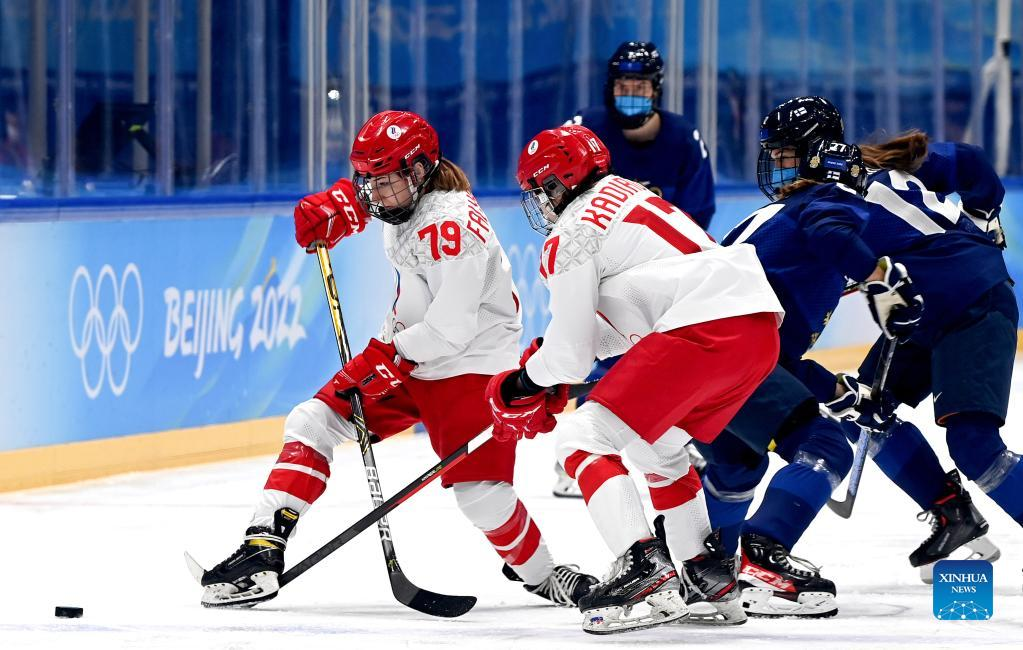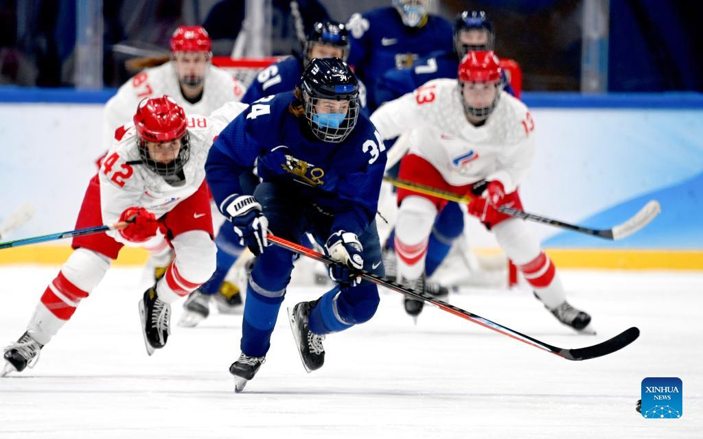 Landysh Falyakhova (1st L) competes during the ice hockey women's preliminary round group A match between Finland and ROC at National Indoor Stadium in Beijing, capital of China, Feb. 8, 2022. (Xinhua/Liu Xiao)