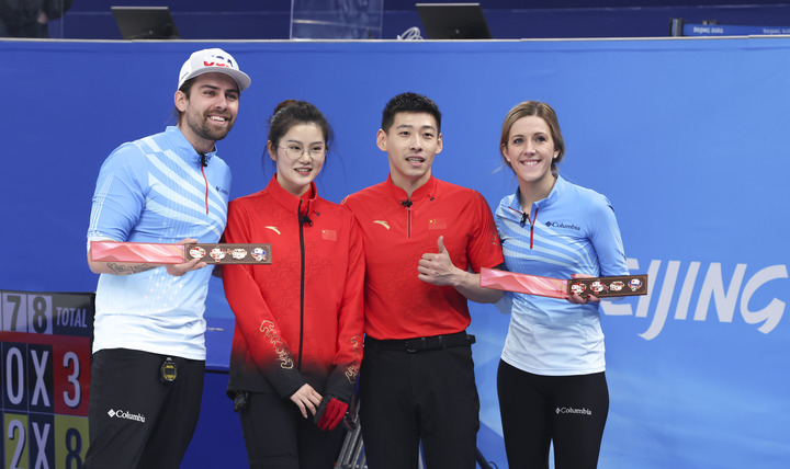 After the United States beat China 7-5 in the mixed doubles round robin on Saturday, Fan Suyuan and Ling Zhi presented their American rivals, Christopher Plys and Vicky Persinger, with a set of commemorative pin badges featuring Bing Dwen Dwen, the panda mascot of the Games.