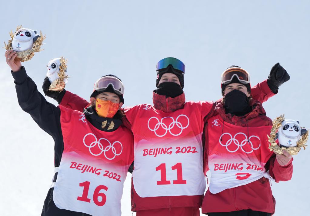 Su Yiming (L) of China, Max Parrot (C) and Mark McMorris of Canada pose during the flower ceremony after men's snowboard slopestyle final at the Genting Snow Park in Zhangjiakou, north China's Hebei Province, Feb. 7, 2022. (Xinhua/Yang Shiyao)