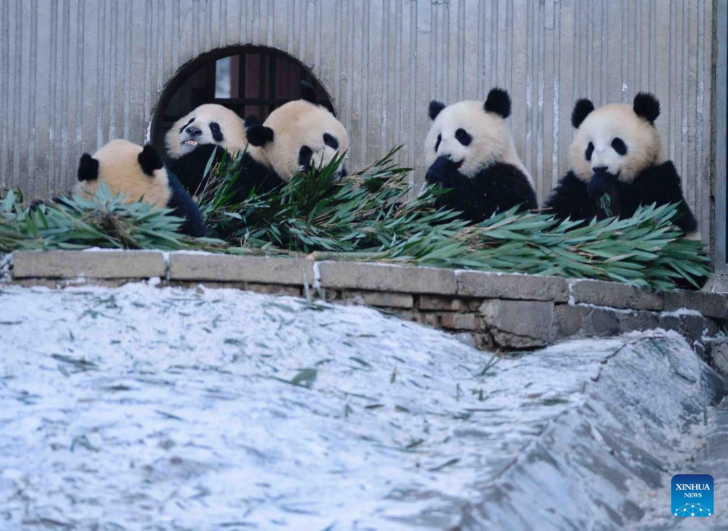 Giant pandas eat at the snow-covered Shenshuping base of the China Conservation and Research Center for Giant Panda in Wolong, southwest China's Sichuan Province, Feb. 9, 2022. (Xinhua/Liu Kun)