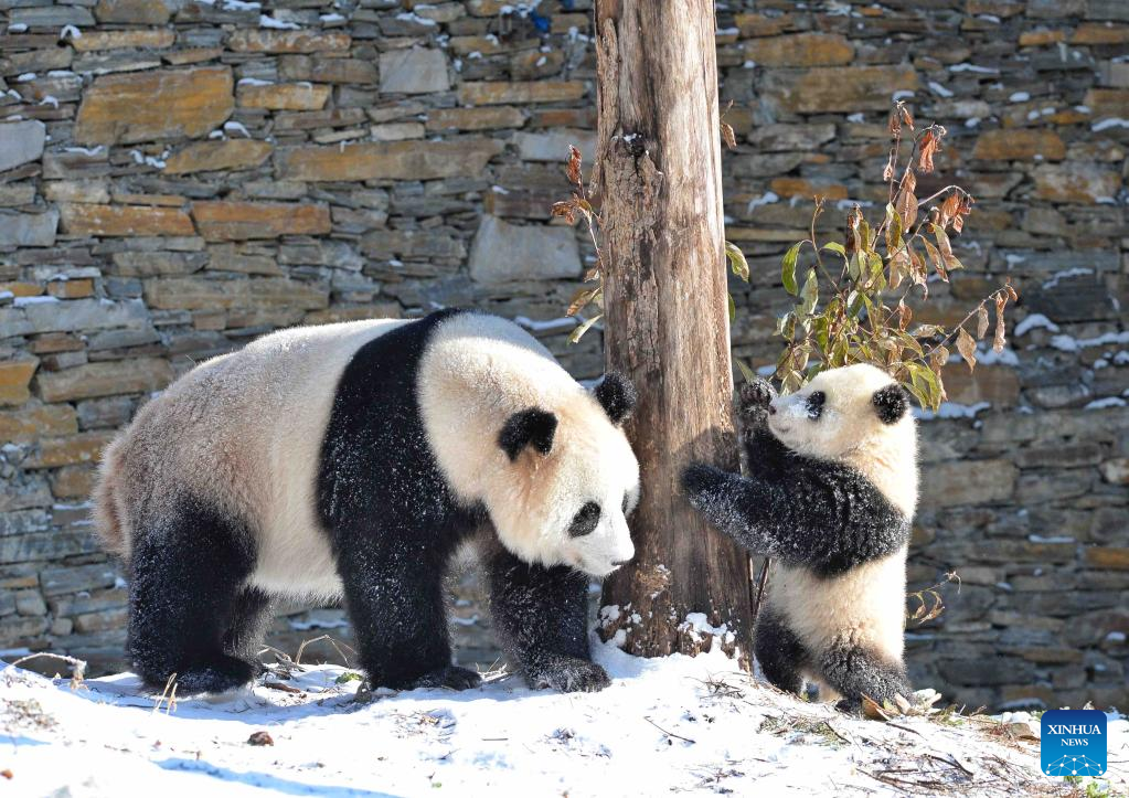A giant panda plays with its cub at the snow-covered Shenshuping base of the China Conservation and Research Center for Giant Panda in Wolong, southwest China's Sichuan Province, Feb. 9, 2022. (Xinhua/Liu Kun)