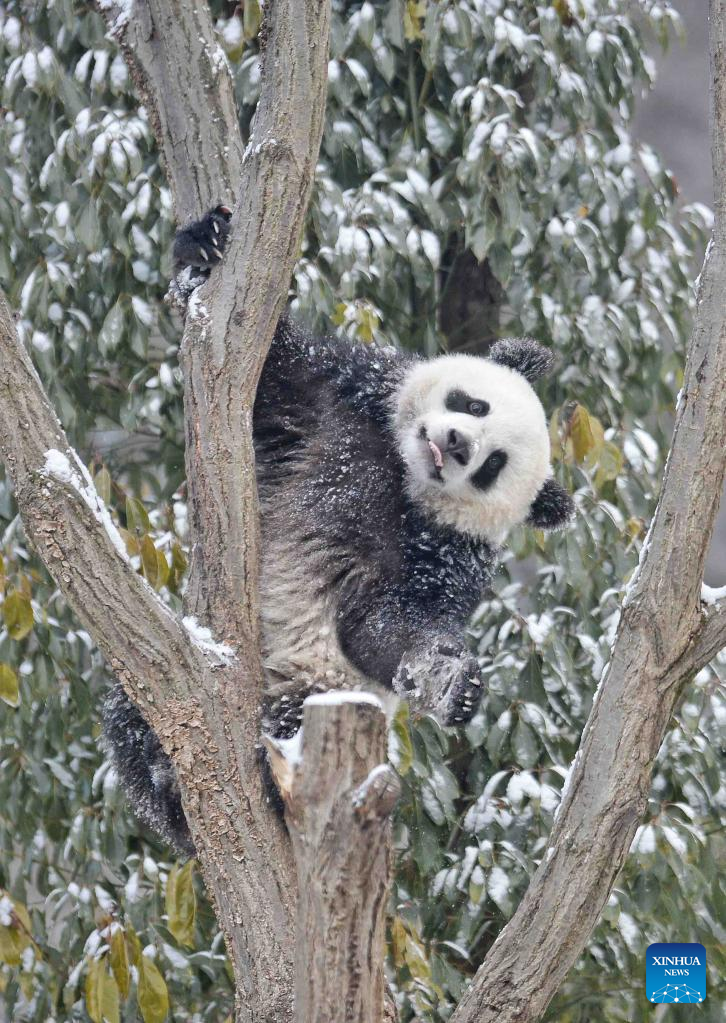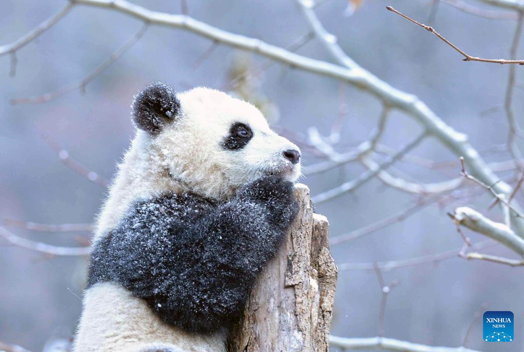 A giant panda plays in a tree at the snow-covered Shenshuping base of the China Conservation and Research Center for Giant Panda in Wolong, southwest China's Sichuan Province, Feb. 9, 2022. (Xinhua/Liu Kun)