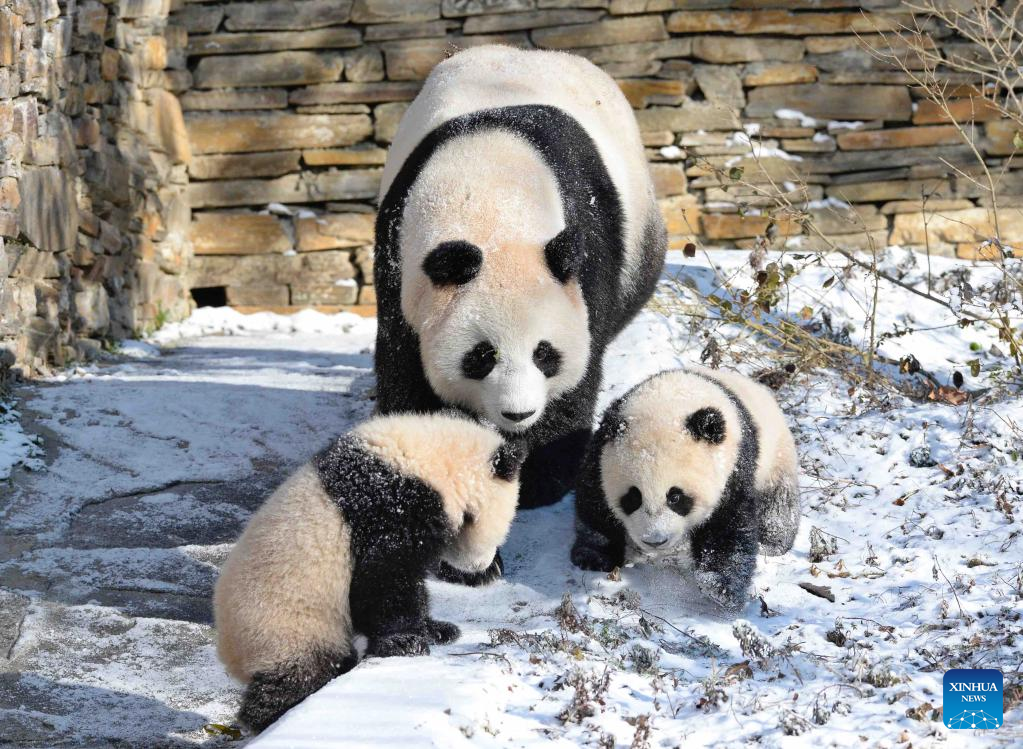 A giant panda plays with its cubs at the snow-covered Shenshuping base of the China Conservation and Research Center for Giant Panda in Wolong, southwest China's Sichuan Province, Feb. 9, 2022. (Xinhua/Liu Kun)