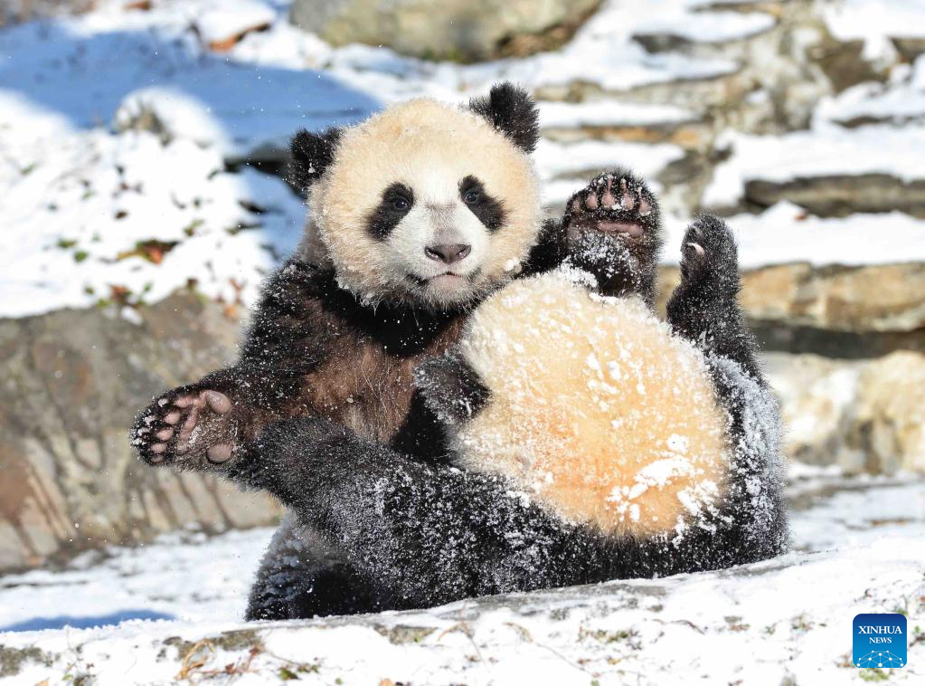 Giant pandas are seen at the snow-covered Shenshuping base of the China Conservation and Research Center for Giant Panda in Wolong, southwest China's Sichuan Province, Feb. 9, 2022. (Xinhua/Liu Kun)