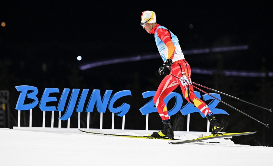 Zhao Jiawen of China competes during Nordic Combined Individual Gundersen Normal Hill/10km, Cross-Country at the National Cross-Country Skiing Center in Zhangjiakou, north China's Hebei Province on Feb. 9, 2022. (Xinhua/Feng Kaihua)