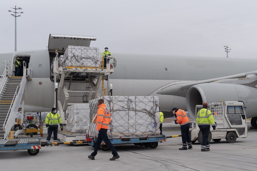 Staff members transfer the first batch of China's Sinopharm COVID-19 vaccine purchased by Hungary at the Liszt Ferenc International Airport in Budapest, Hungary, Feb. 16, 2021. (Photo by Attila Volgyi/Xinhua)