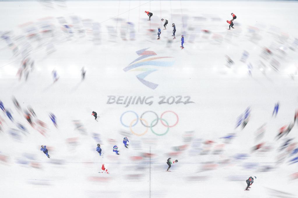 The multiple exposure photo taken on Feb. 9, 2022 shows athletes warming up before the men's 1,500m short track speed skating final at Capital Indoor Stadium in Beijing, capital of China. (Xinhua/Xu Zijian)