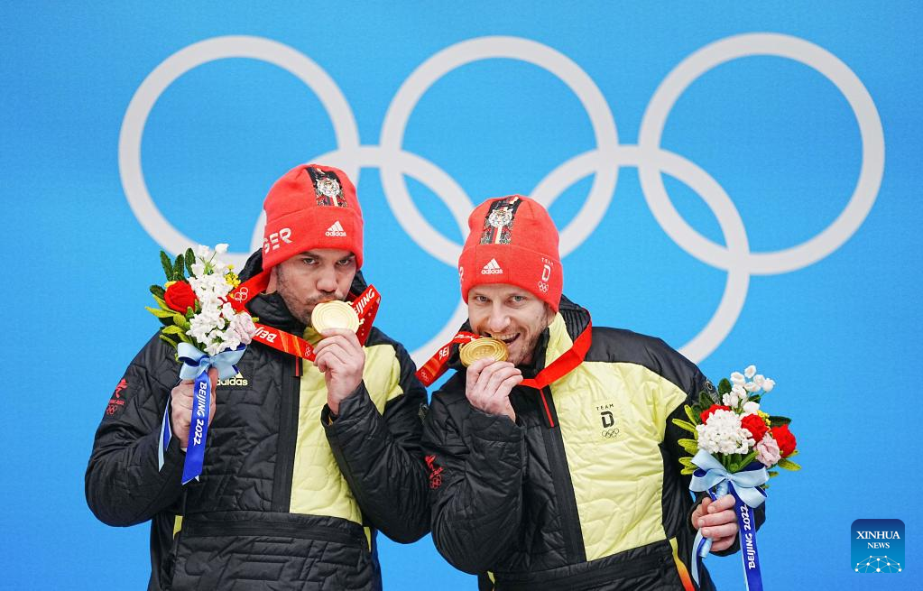 Gold medalists Tobias Wendl/Tobias Arlt of Germany celebrate during the awarding ceremony of luge doubles run at the Yanqing National Sliding Centre in Yanqing district of Beijing, capital of China, Feb. 9, 2022. (Xinhua/Jiang Wenyao)