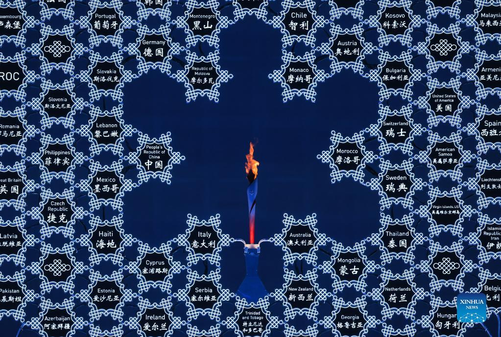Photo taken on Feb. 4, 2022 shows a cauldron holding the Olympic flame during the opening ceremony of the Beijing 2022 Olympic Winter Games at the National Stadium in Beijing, capital of China. (Xinhua/Cao Can)