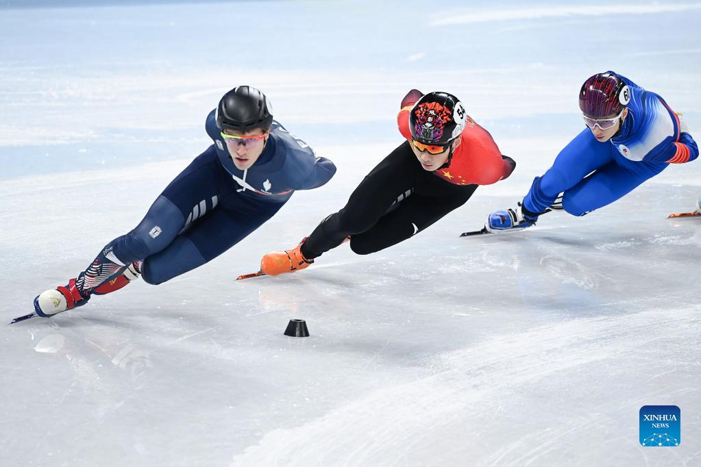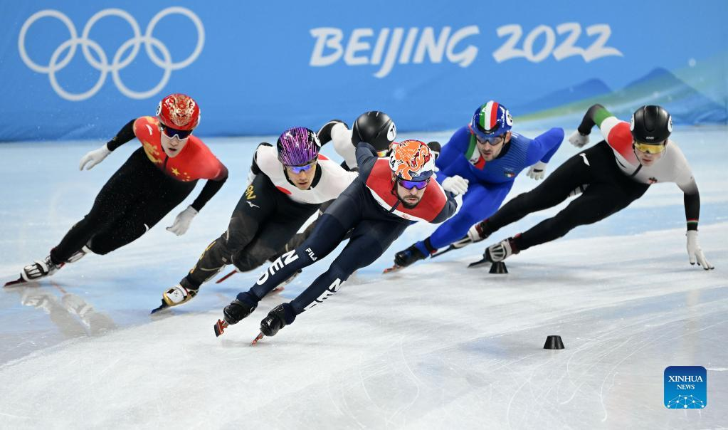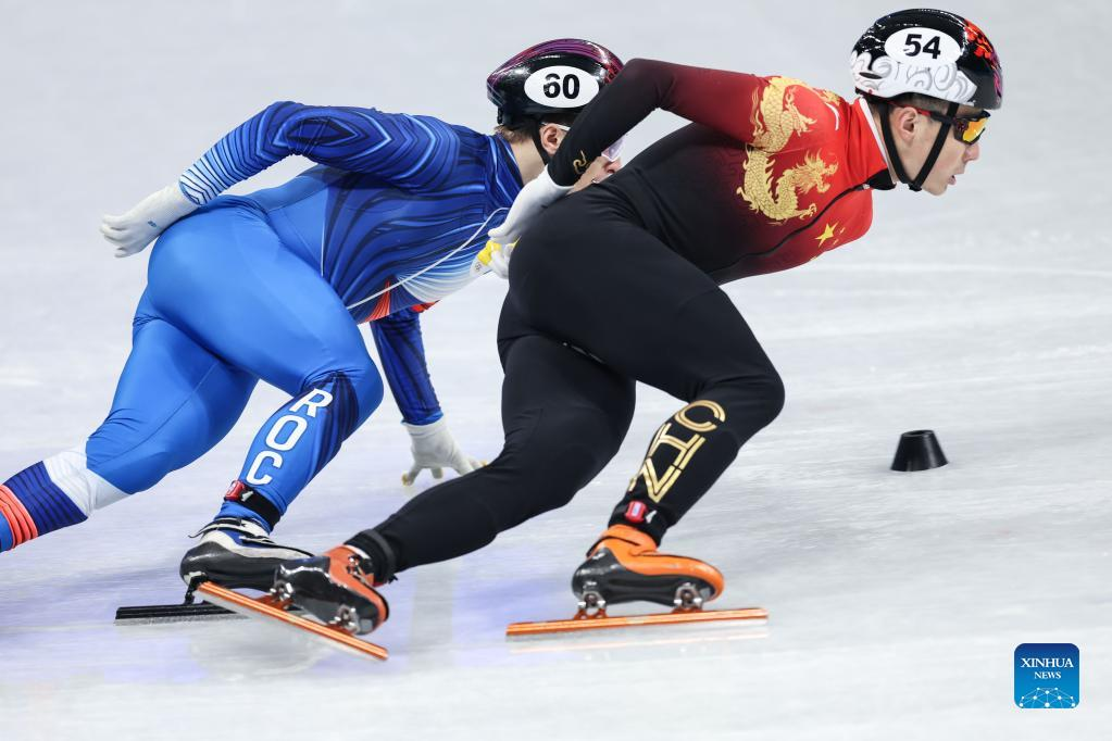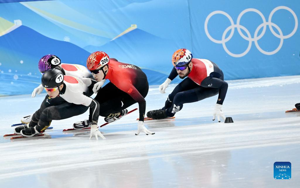 Ren Ziwei (C) of China competes during the men's 1,500m quarterfinal of short track speed skating at Capital Indoor Stadium in Beijing, capital of China, Feb. 9, 2022. (Xinhua/Xiong Qi)