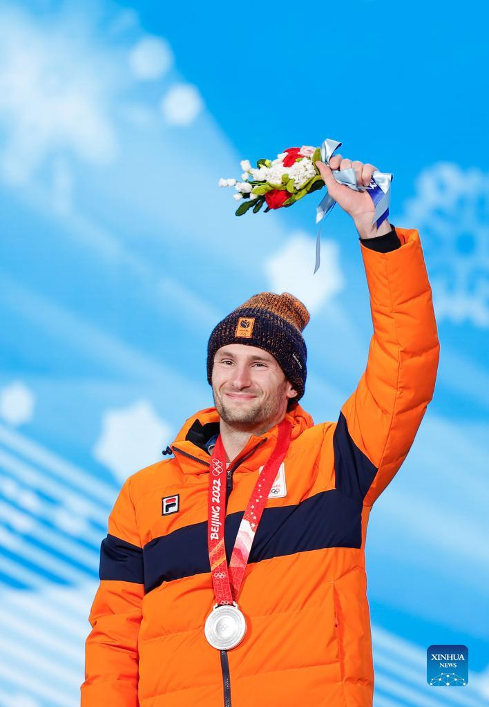 Silver medalist Thomas Krol of the Netherlands reacts during the awarding ceremony of speed skating men's 1,500m at the Beijing Medals Plaza of the Winter Olympics in Beijing, capital of China, Feb. 9, 2022. (Xinhua/Ding Xu)