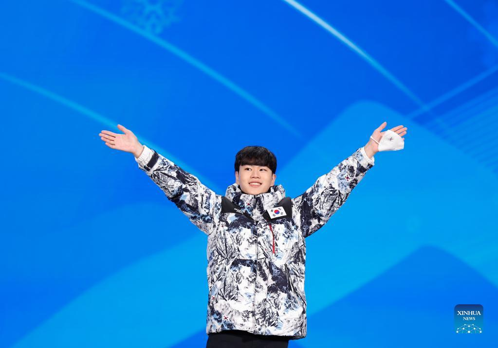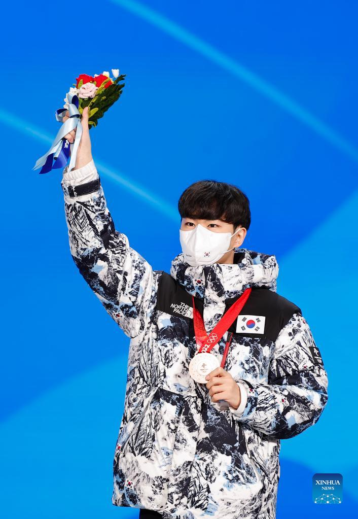 Bronze medalist Kim Minseok of South Korea reacts during the awarding ceremony of speed skating men's 1,500m at the Beijing Medals Plaza of the Winter Olympics in Beijing, capital of China, Feb. 9, 2022. (Xinhua/Ding Xu)
