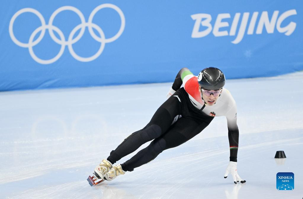 Shaolin Sandor Liu of Hungary competes during the men's 1,500m quarterfinal of short track speed skating at Capital Indoor Stadium in Beijing, capital of China, Feb. 9, 2022. (Xinhua/Li Yibo)