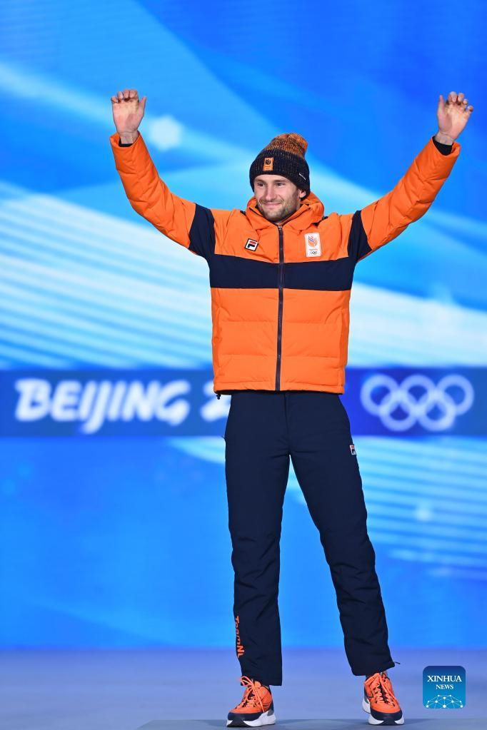 Silver medalist Thomas Krol of the Netherlands reacts during the awarding ceremony of speed skating men's 1,500m at the Beijing Medals Plaza of the Winter Olympics in Beijing, capital of China, Feb. 9, 2022. (Xinhua/Huang Zongzhi)