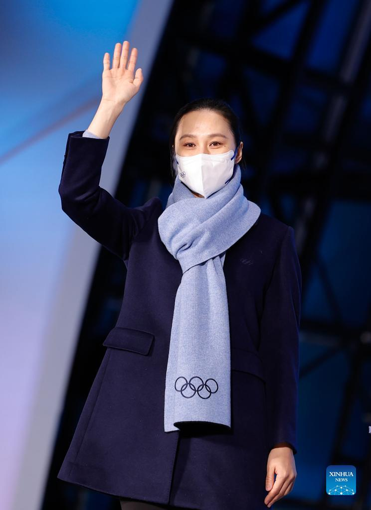 IOC member Zhang Hong waves before presenting medals during the awarding ceremony of speed skating men's 1,500m at the Beijing Medals Plaza of the Winter Olympics in Beijing, capital of China, Feb. 9, 2022. (Xinhua/Ding Xu)