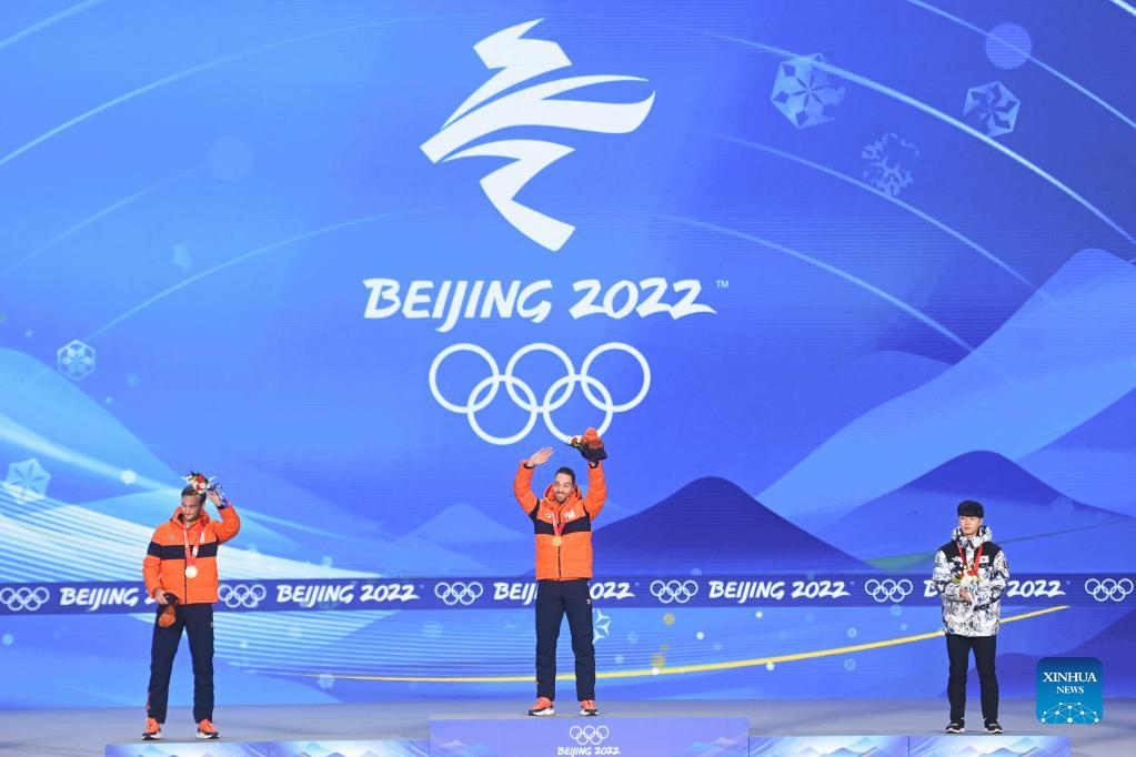 Gold medalist Kjeld Nuis (C) and Silver medalist Thomas Krol (L) of the Netherlands, Bronze medalist Kim Minseok of South Korea react during the awarding ceremony of speed skating men's 1,500m at the Beijing Medals Plaza of the Winter Olympics in Beijing, capital of China, Feb. 9, 2022. (Xinhua/Huang Zongzhi)