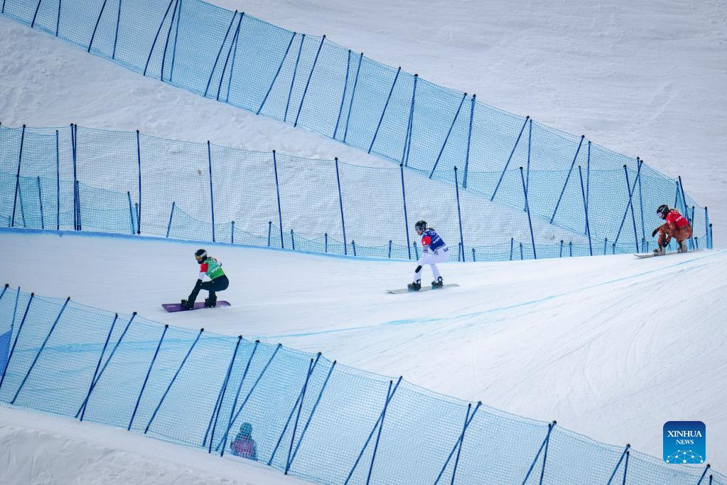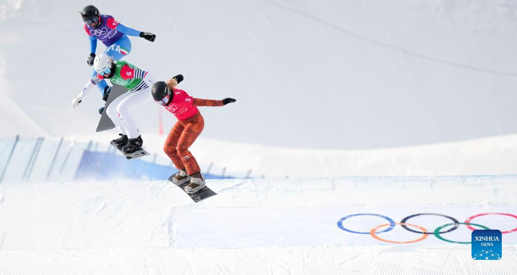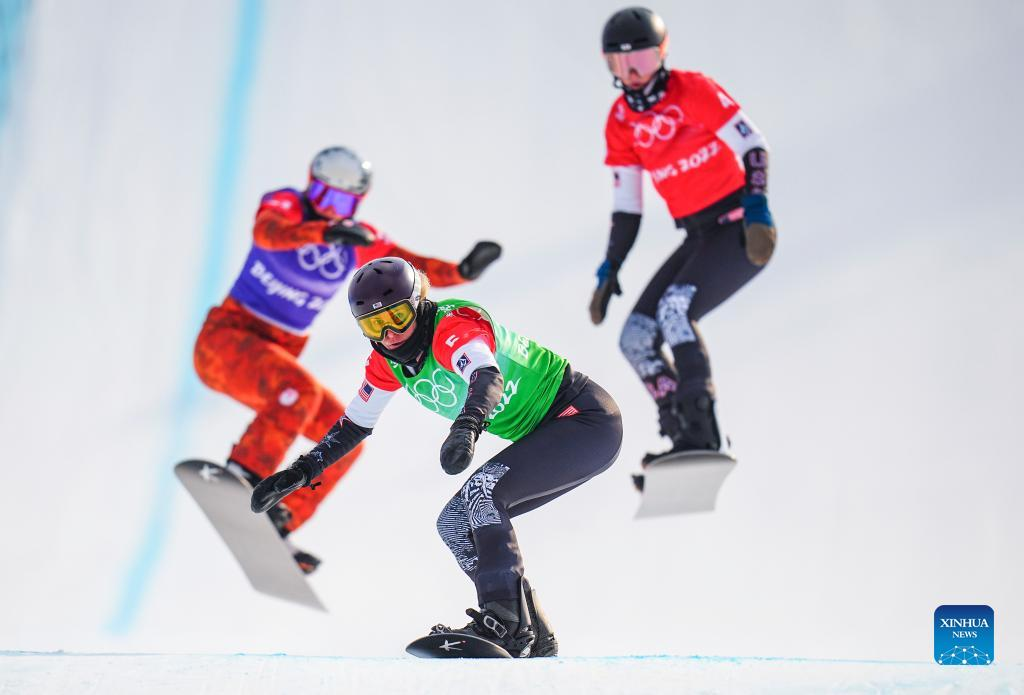 Gold medallist Lindsey Jacobellis (front) of the United States competes during women's snowboard cross 1/4 finals of the Beijing 2022 Winter Olympics at Genting Snow Park in Zhangjiakou, north China's Hebei Province, Feb. 9, 2022.