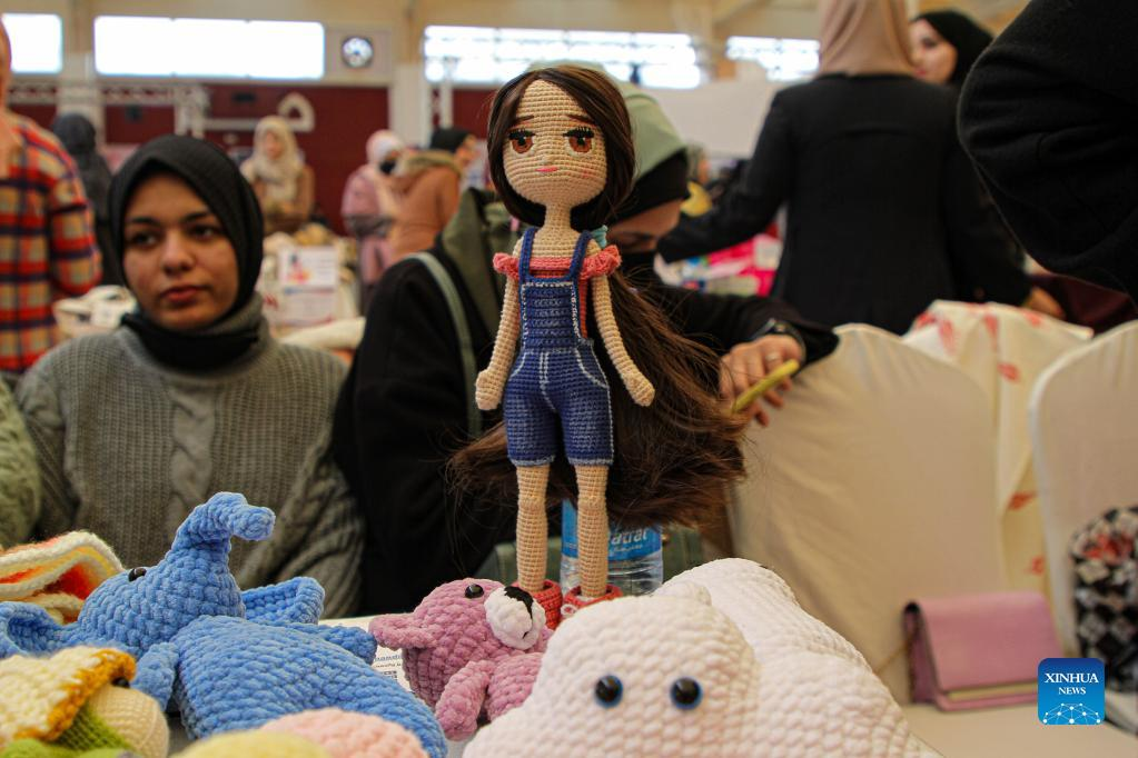 A Palestinian woman participates in an exhibition held to support small business owners at a hotel in Gaza City, on Feb. 9, 2022. (Photo by Rizek Abdeljawad/Xinhua)