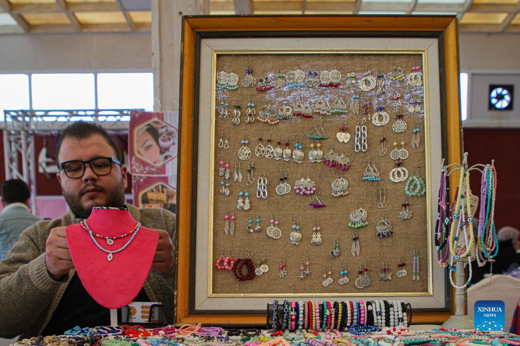 A Palestinian man participates in an exhibition held to support small business owners at a hotel in Gaza City, on Feb. 9, 2022. (Photo by Rizek Abdeljawad/Xinhua)