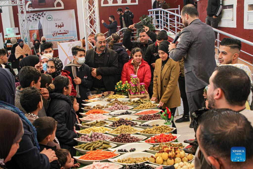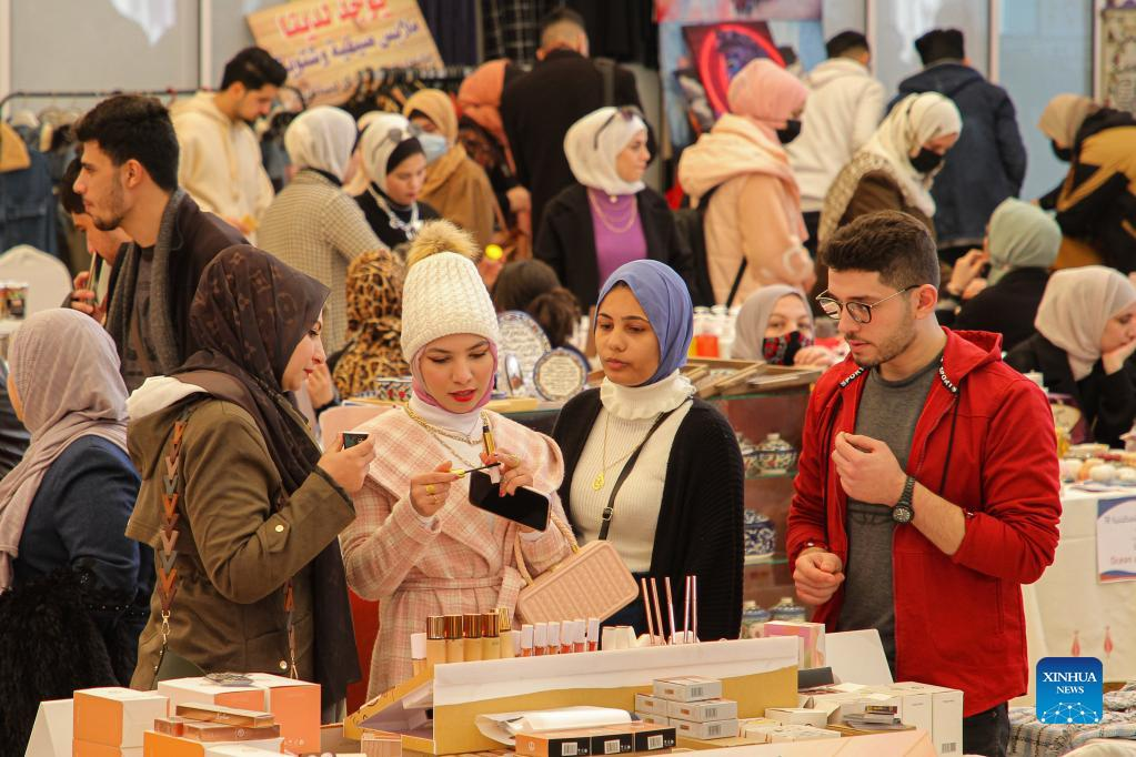 People visit an exhibition held to support small business owners at a hotel in Gaza City, on Feb. 9, 2022. (Photo by Rizek Abdeljawad/Xinhua)