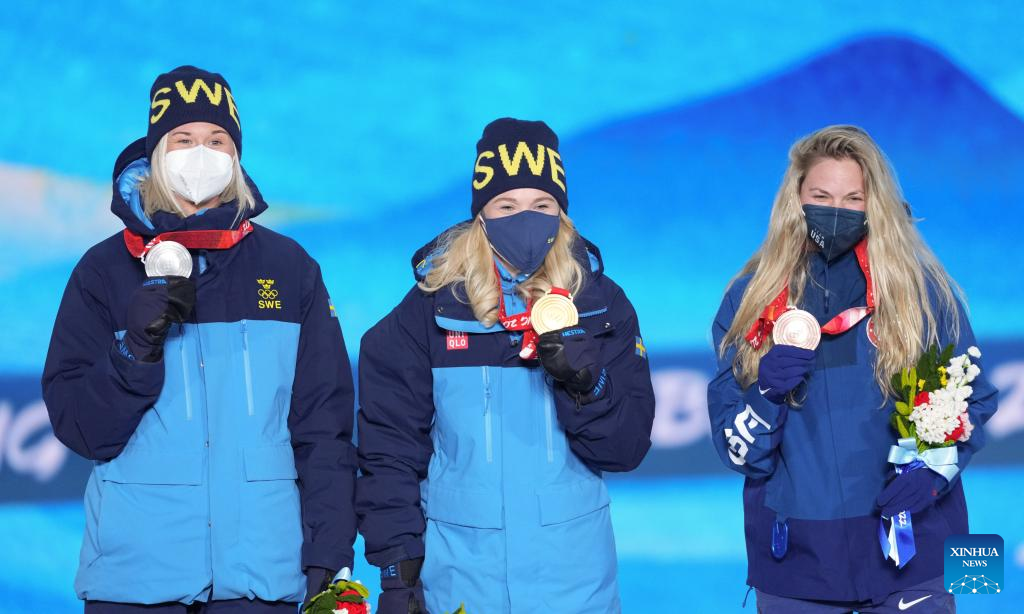 Gold medalist Jonna Sundling (C) and Silver medalist Maja Dahlqvist (L) of Sweden, Bronze medalist Jessie Diggins of the United States pose for photos during the awarding ceremony of women's cross-country skiing sprint free at Zhangjiakou Medals Plaza of the Winter Olympics in Zhangjiakou, north China's Hebei Province, Feb. 9, 2022. (Xinhua/Ding Ting)
