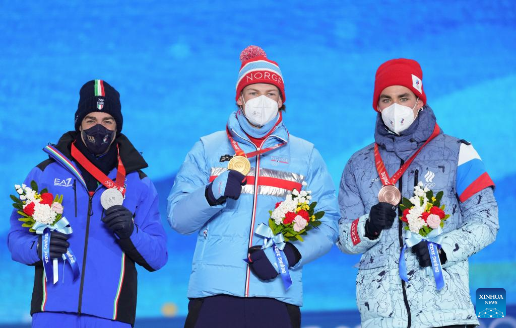 Gold medalist Johannes Hoesflot Klaebo (C) of Norway, Silver medalist Federico Pellegrino (L) of Italy and Bronze medalist Alexander Terentev of ROC pose for photos during the awarding ceremony of men's cross-country skiing sprint free at Zhangjiakou Medals Plaza of the Winter Olympics in Zhangjiakou, north China's Hebei Province, Feb. 9, 2022. (Xinhua/Ding Ting)