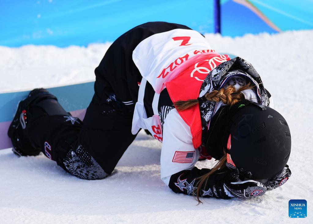 Chloe Kim of the United States reacts during the women's snowboard halfpipe final at Genting Snow Park in Zhangjiakou, north China's Hebei Province, Feb. 10, 2022. (Xinhua/Xu Chang)