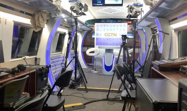 Photo shows an ultra-high-definition studio with 5G transmission inside the high-speed train. (Photo/ gzstv.com)