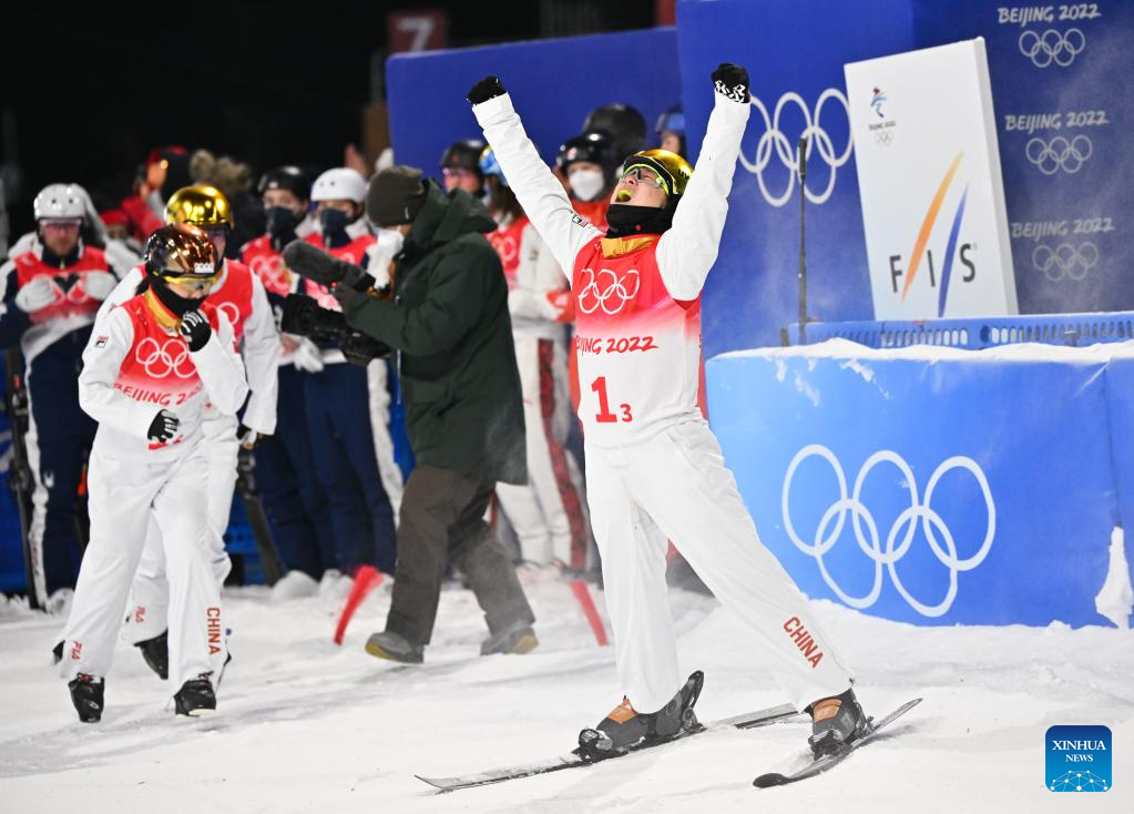 Qi Guangpu (R) of China reacts during the freestyle skiing mixed team aerials final at Genting Snow Park in Zhangjiakou, north China's Hebei Province, Feb. 10, 2022. (Xinhua/Zhu Zheng)