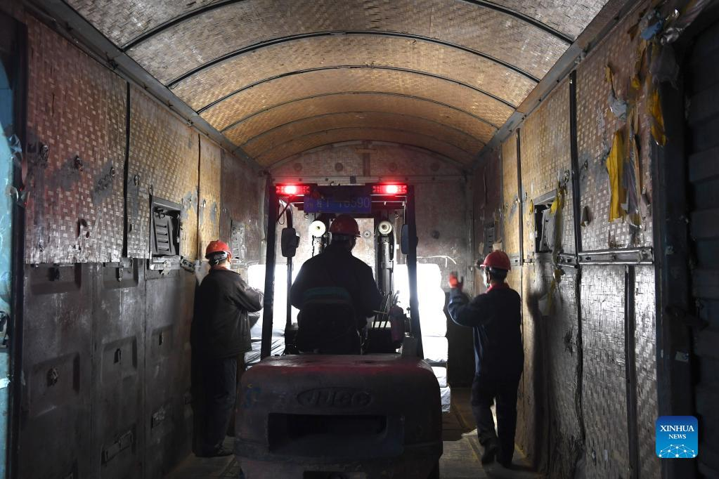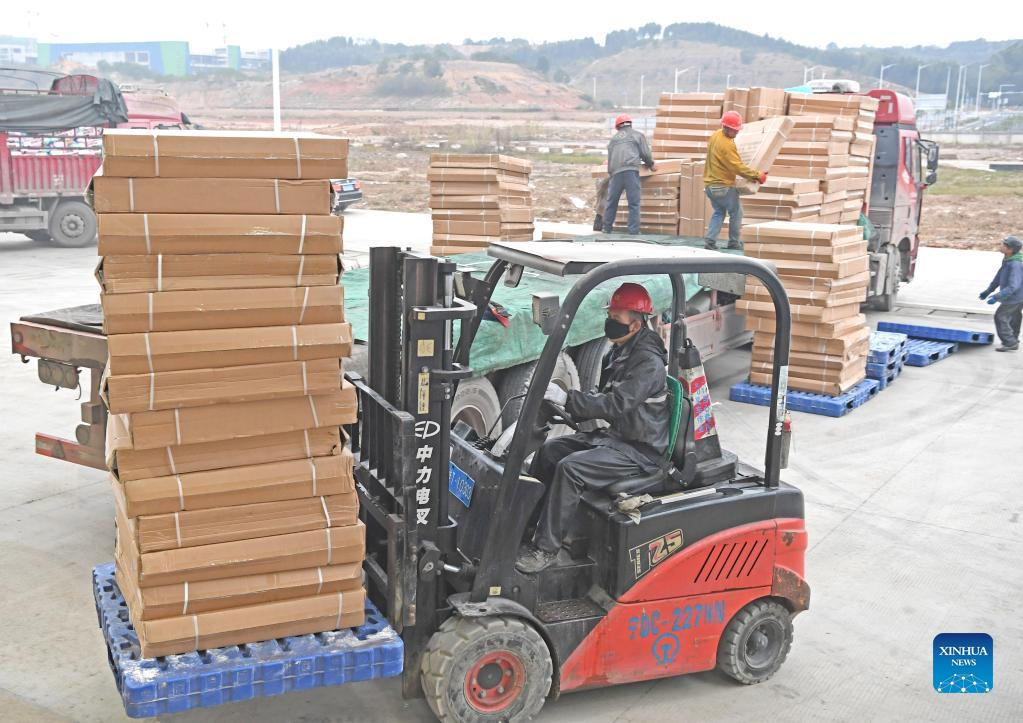 Staff members load a train with emergency supplies at the Nanning international railway port in Nanning, south China's Guangxi Zhuang Autonomous Region, Feb. 10, 2022. A batch of emergency supplies including rice, tents and foldable beds has been loaded on a train in the port to support the fight against the COVID-19 in Baise, a city witnessing a resurgence of COVID-19 cases recently. (Xinhua/Zhou Hua)