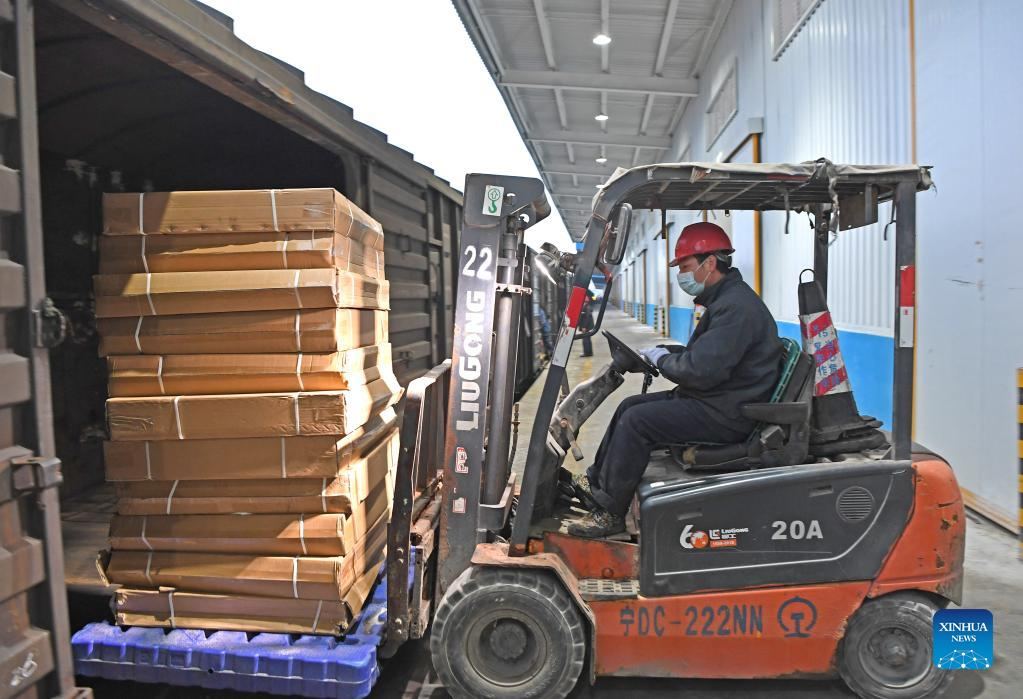 A staff member loads a train with emergency supplies at the Nanning international railway port in Nanning, south China's Guangxi Zhuang Autonomous Region, Feb. 10, 2022. A batch of emergency supplies including rice, tents and foldable beds has been loaded on a train in the port to support the fight against the COVID-19 in Baise, a city witnessing a resurgence of COVID-19 cases recently. (Xinhua/Zhou Hua)