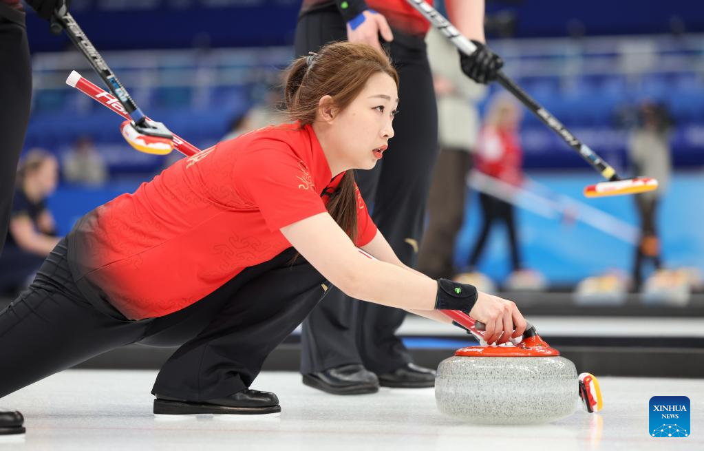 Dong Ziqi of China competes during the Curling Women's Round Robin Session 2 of the Beijing 2022 Winter Olympics between China and Switzerland at the National Aquatics Centre in Beijing, capital of China, Feb. 10, 2022. (Xinhua/Lan Hongguang)