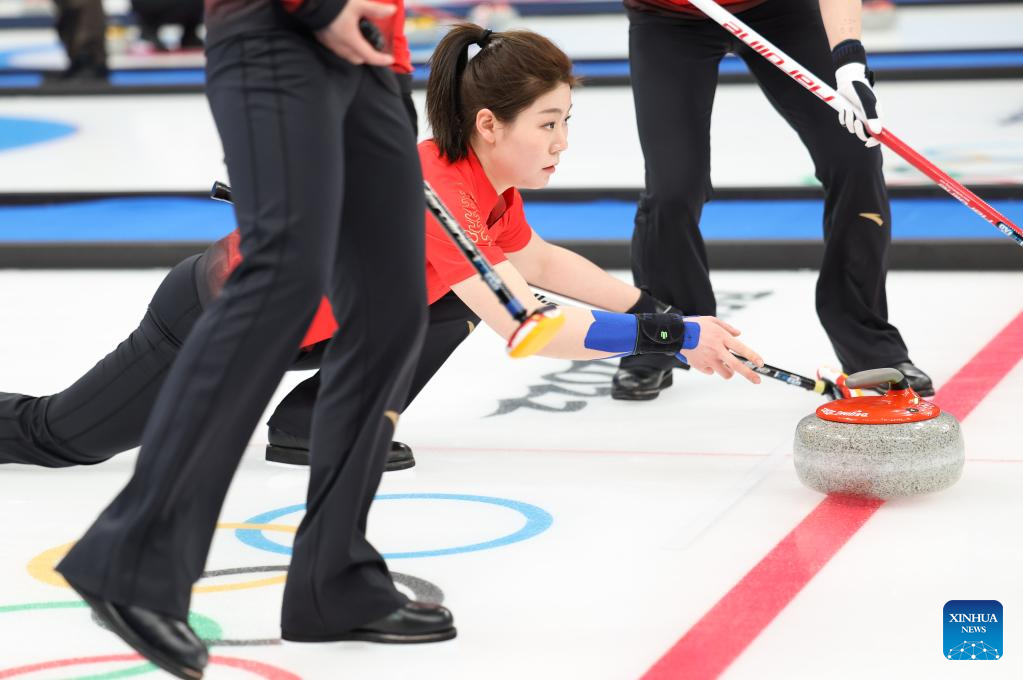 Zhang Lijun of China curls the stone during the Curling Women's Round Robin Session 2 of the Beijing 2022 Winter Olympics between China and Switzerland at the National Aquatics Centre in Beijing, capital of China, Feb. 10, 2022. (Xinhua/Lan Hongguang)