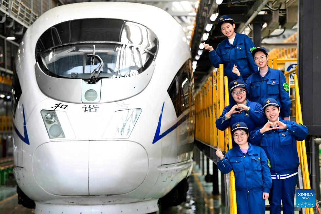 Members of a maintenance team pose for a group photo at Jinan bullet train service station in Jinan, east China's Shandong Province, Feb. 10, 2022. There is a maintenance team composed of five post-98s women at Jinan bullet train service station. Not long after starting their work in October last year, these young mechanists witnessed their first Spring Festival travel rush.