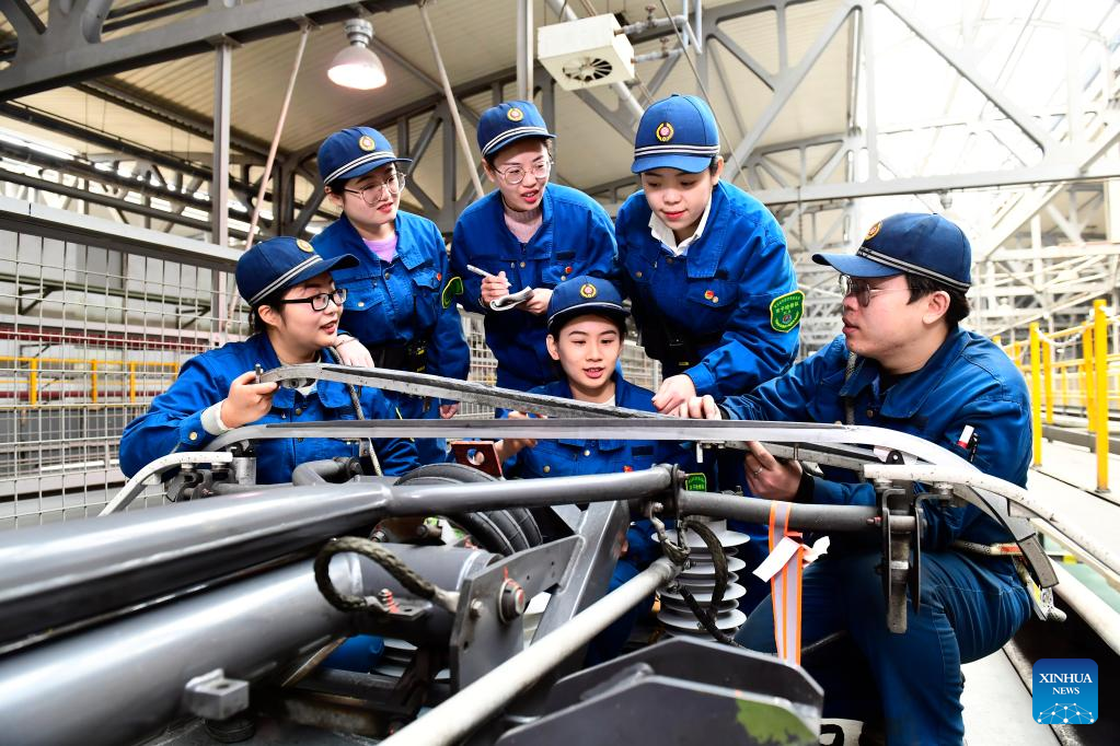 Senior machinist Song Hao (1st R) instructs as members of a maintenance team look on at Jinan bullet train service station in Jinan, east China's Shandong Province, Feb. 10, 2022. There is a maintenance team composed of five post-98s women at Jinan bullet train service station. Not long after starting their work in October last year, these young mechanists witnessed their first Spring Festival travel rush.