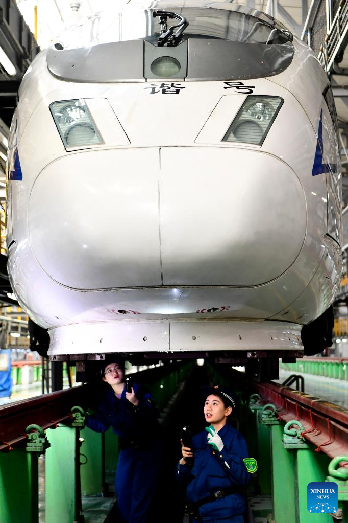 Faced with a workload of 23 bullet trains to be checked every day during the travel rush, the team members spared no efforts to maintain the trains for safe operation. (Xinhua/Guo Xulei)