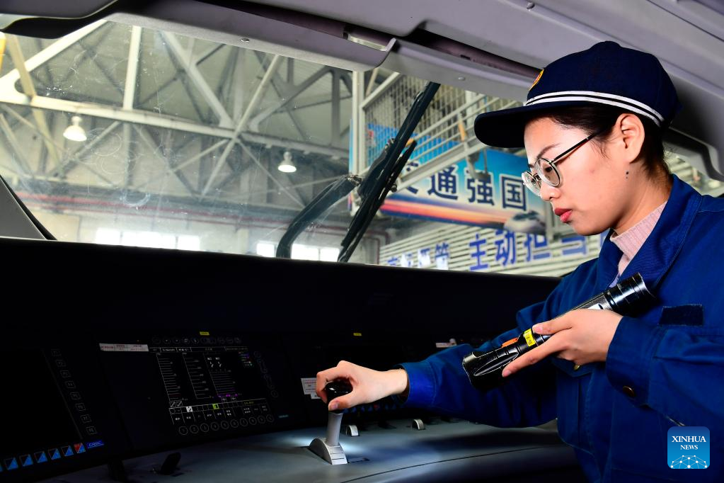 Xiao Yunxiao, a bullet train mechanist, checks a train at Jinan bullet train service station in Jinan, east China's Shandong Province, Feb. 10, 2022. There is a maintenance team composed of five post-98s women at Jinan bullet train service station. Not long after starting their work in October last year, these young mechanists witnessed their first Spring Festival travel rush.