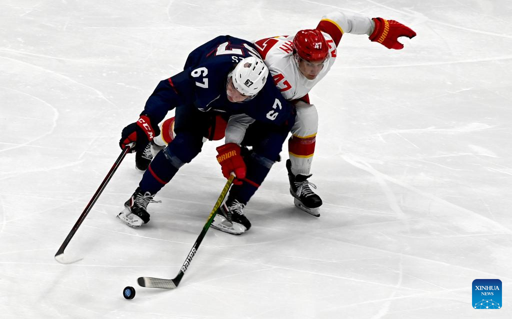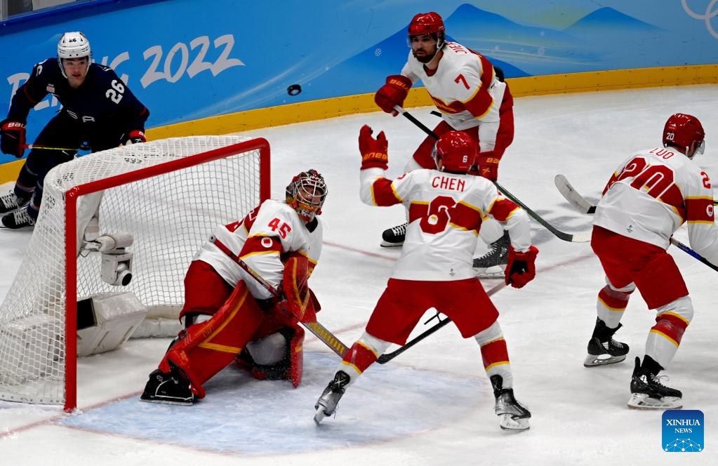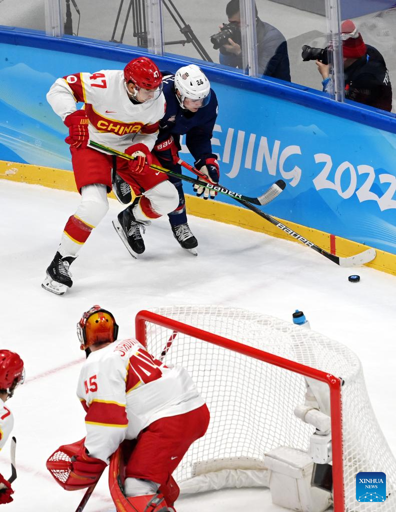 Athletes compete during ice hockey men's Group A match between the United States and China at National Indoor Stadium in Beijing, capital of China, Feb. 10, 2022. (Xinhua/Li Ziheng)