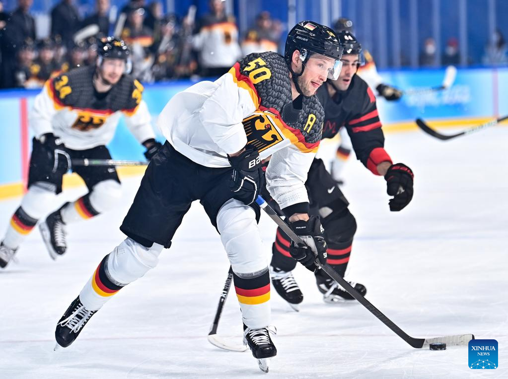 Patrick Hager (front) of Germany competes during ice hockey men's Group A match between Canada and Germany at Wukesong Sports Centre in Beijing, capital of China, Feb. 10, 2022. (Xinhua/Song Yanhua)