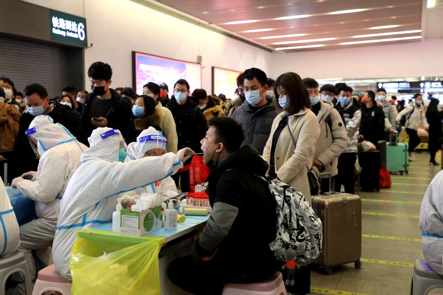 Medical workers take throat swabs from passengers for COVID-19 nucleic acid tests in Suzhou Railway Station in Suzhou, east China's Jiangsu Province, Feb. 6, 2022. (Photo by Hang Xingwei/Xinhua)