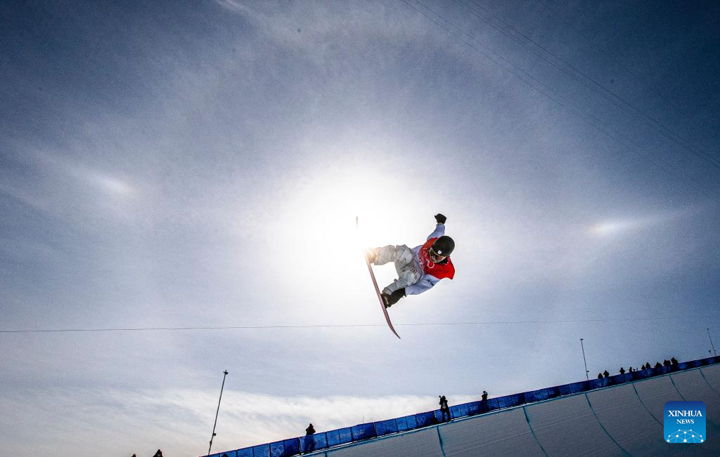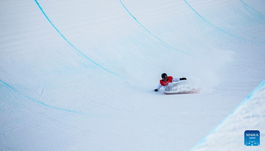 Jan Scherrer of Switzerland competes during men's snowboard halfpipe final of Beijing 2022 Winter Olympics at Genting Snow Park in Zhangjiakou, north China's Hebei Province, Feb. 11, 2022. (Xinhua/Xu Chang)
