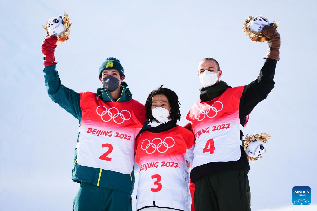 Hirano Ayumu (C) of Japan, Scotty James (L) of Australia and Jan Scherrer of Switzerland pose for photos during the flower ceremony after the men's snowboard halfpipe final at Genting Snow Park in Zhangjiakou, north China's Hebei Province, Feb. 11, 2022. (Xinhua/Xu Chang)