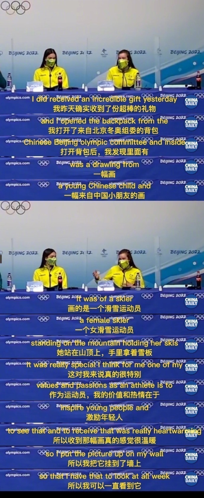 Britt Cox, an Australian freestyle skier, said in a press conference that “I opened the backpack from the Chinese Beijing Olympic Committee, and inside was a drawing from a young Chinese child. And it was of a skier, a female skier, standing on the mountain holding her skis. It was really special I think. For me, one of my values and passions as an athlete is to inspire young people and to see that and to receive that was really heartwarming. So I put the picture up on my wall, so that I have that to look at all week.”