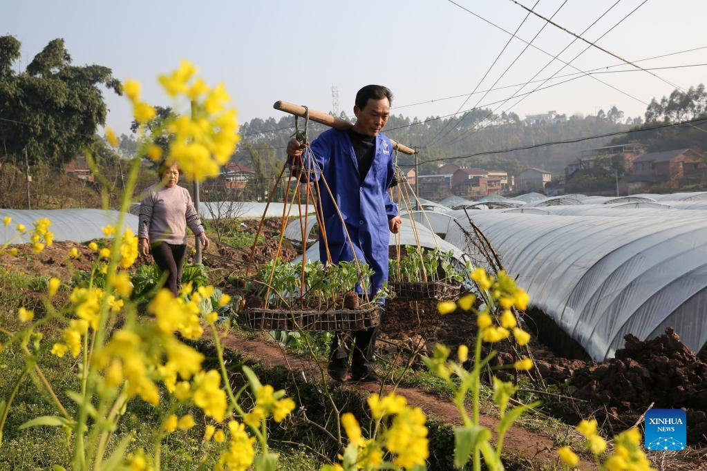 Villagers transplant watermelon seedlings at a planting base in Gaochong Village of Neijiang City, southwest China's Sichuan Province, Feb. 11, 2022. (Photo by Lan Zitao/Xinhua)