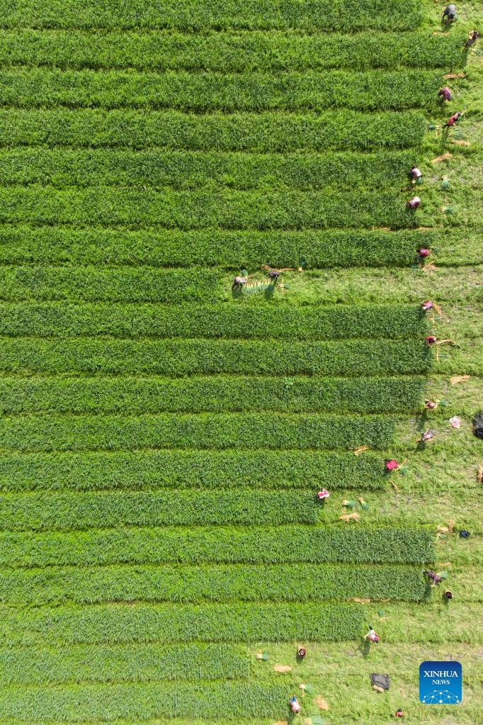 Aerial photo taken on Feb. 11, 2022 shows farmers harvesting garlic shoots in Huohua Village of Neijiang City, southwest China's Sichuan Province. (Photo by Huang Zhenghua/Xinhua)